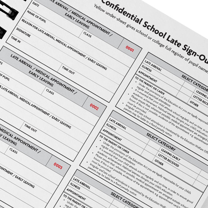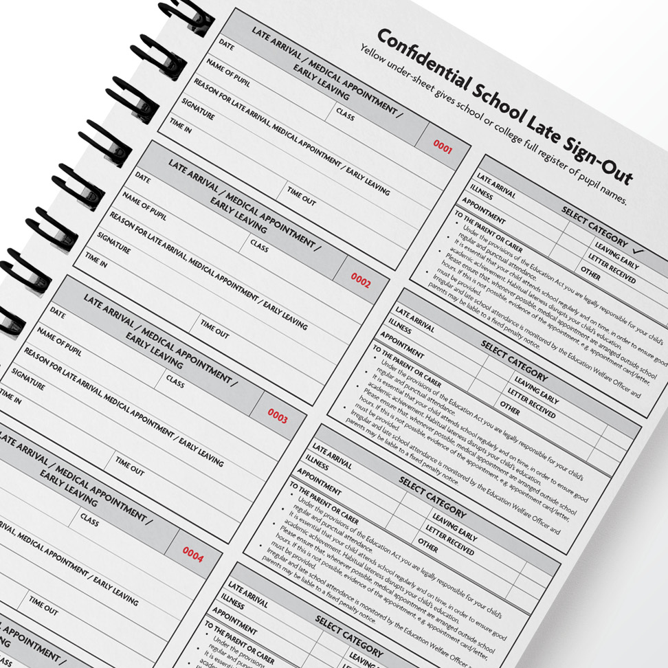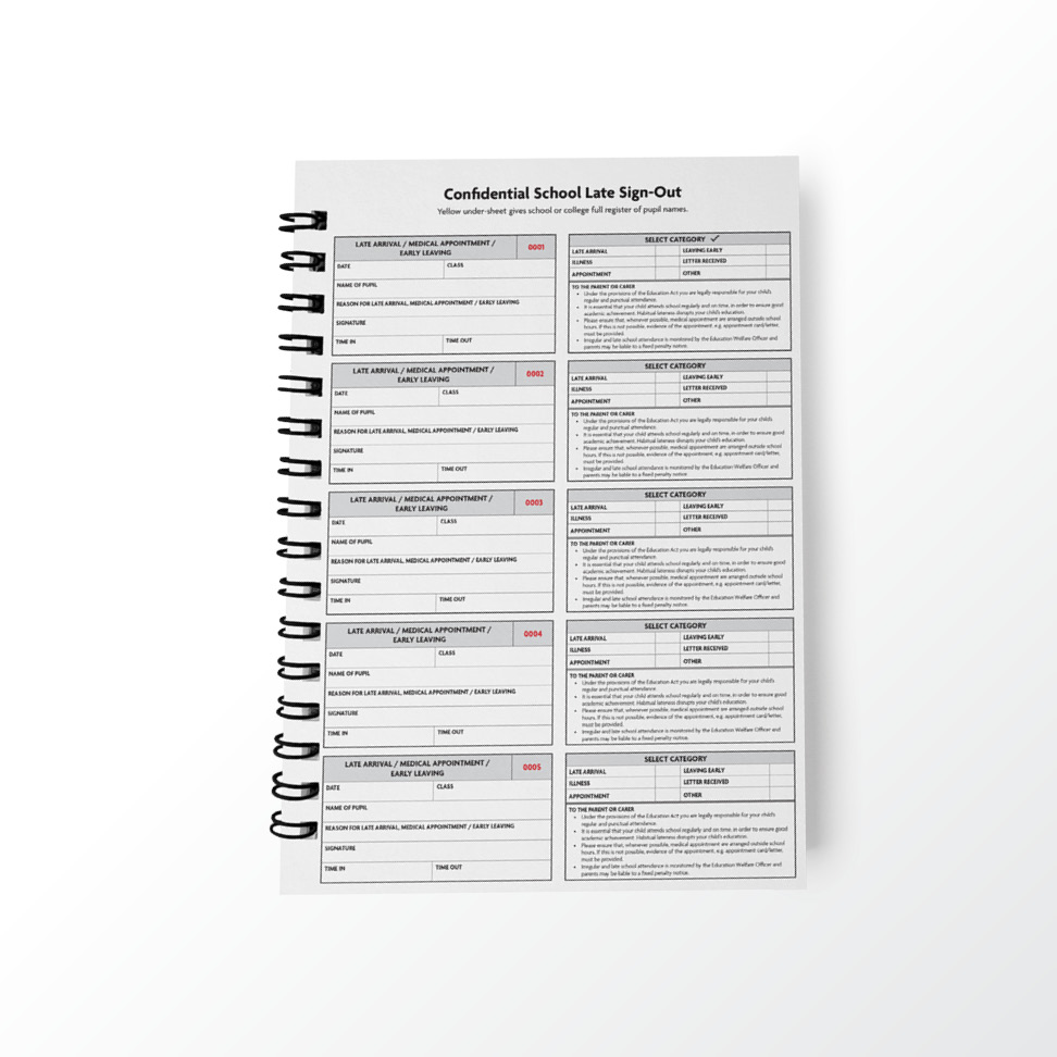 This exclusive, self-duplicating pad is designed to help schools and colleges deal effectively with late arrivals, daytime medical appointments and early leavers. The book itself contains 200 uniquely numbered slips. Each slip is perforated so, once complete, it can be easily removed and given to the pupil.